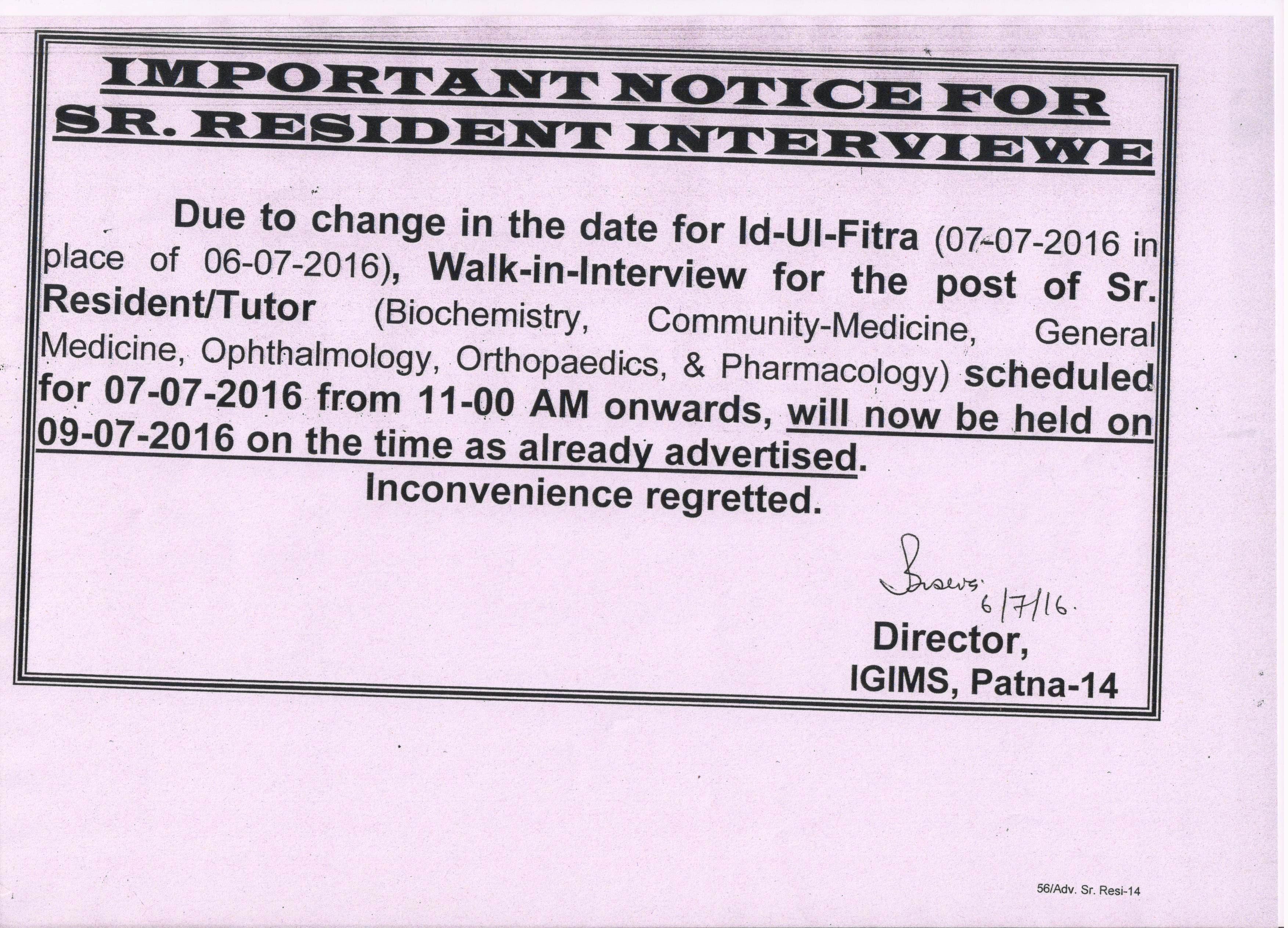 ADDEUNDUM (TO NOTICE ISSUED VIDE ADV. NO. 05 / Sr. RESIDENT – (Adhoc) / IGIMS / Estt. / 2014 FOR WALK-IN-INTERVIEW FOR ADHOC APPOINTMNT OF Sr. RESIDCENT IN THE DEPARTMENT OF E.N.T.)