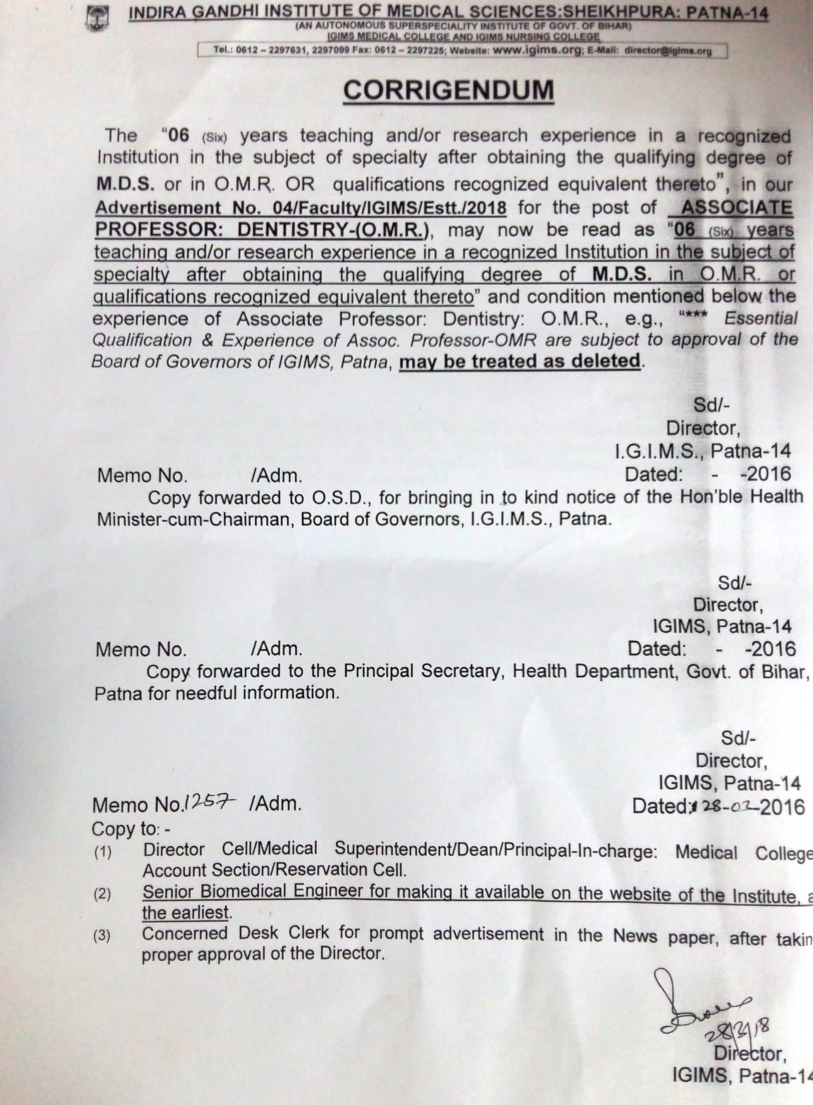Advertisement No. - 02/Faculty/IGIMS/Estt./2014